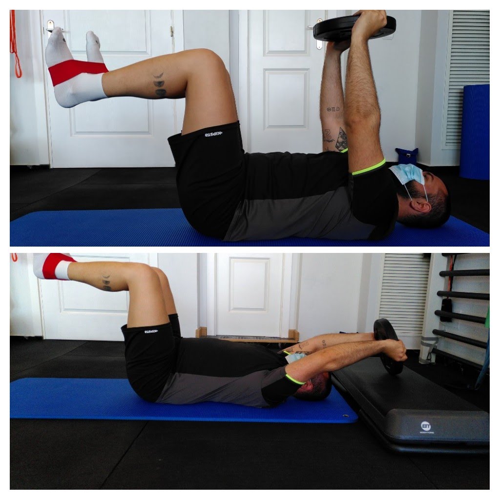 CONTRACCIÓN ABDOMINAL CONTROLANDO DESCENSO DE DISCO. PIERNAS ISOMÉTRICAS, NO SE MUEVEN.