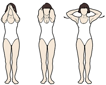 Párese derecho con los pies a la anchura de los hombros. Manos entrelazadas detrás de la cabeza.