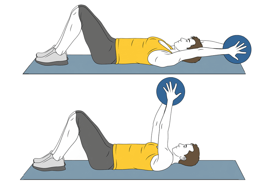 - Mientras exhala, realice una contracción abdominal mientras lleva la pelota/mancuerna hacia atrás con los brazos estirados.